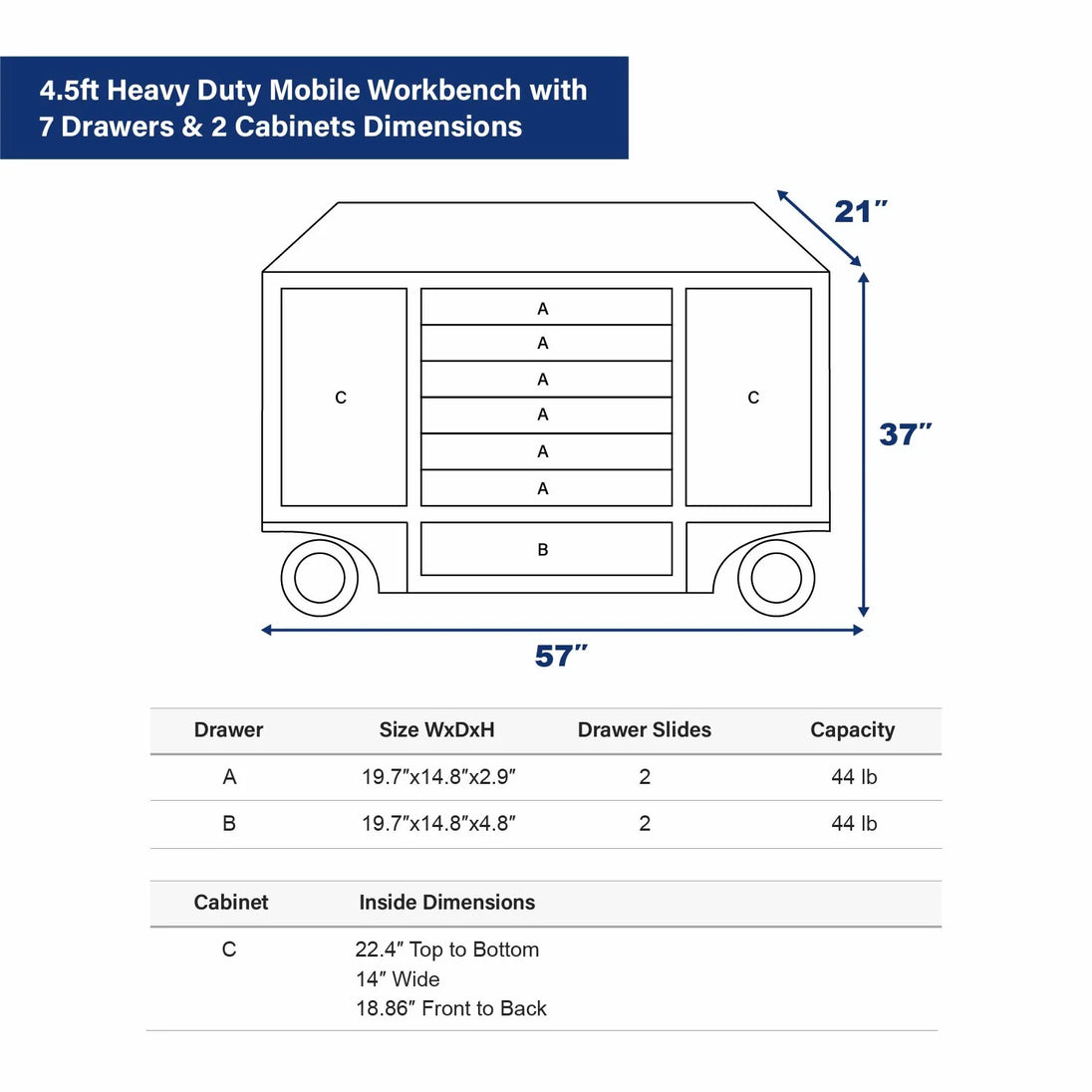 - 4.5ft compact rolling workbench with drawers and cabinets