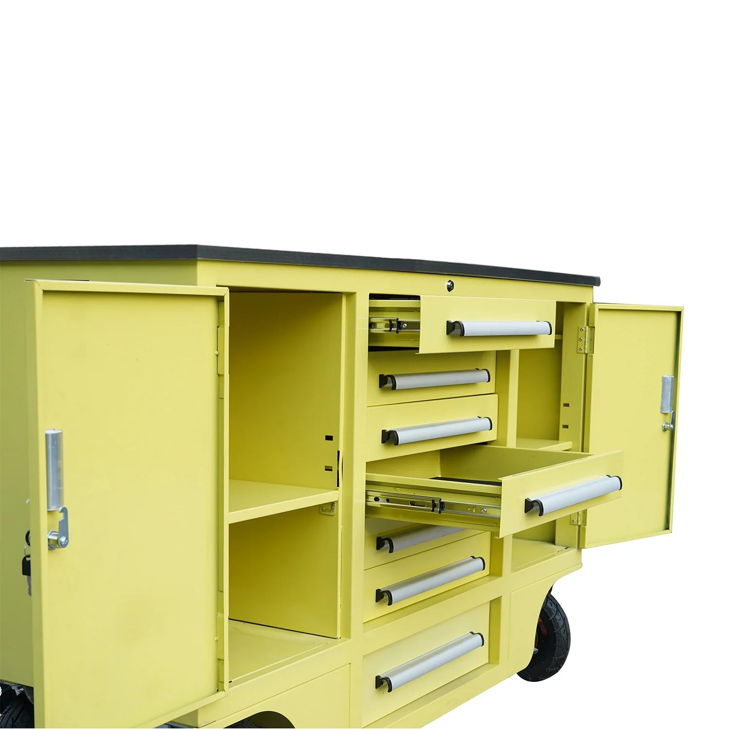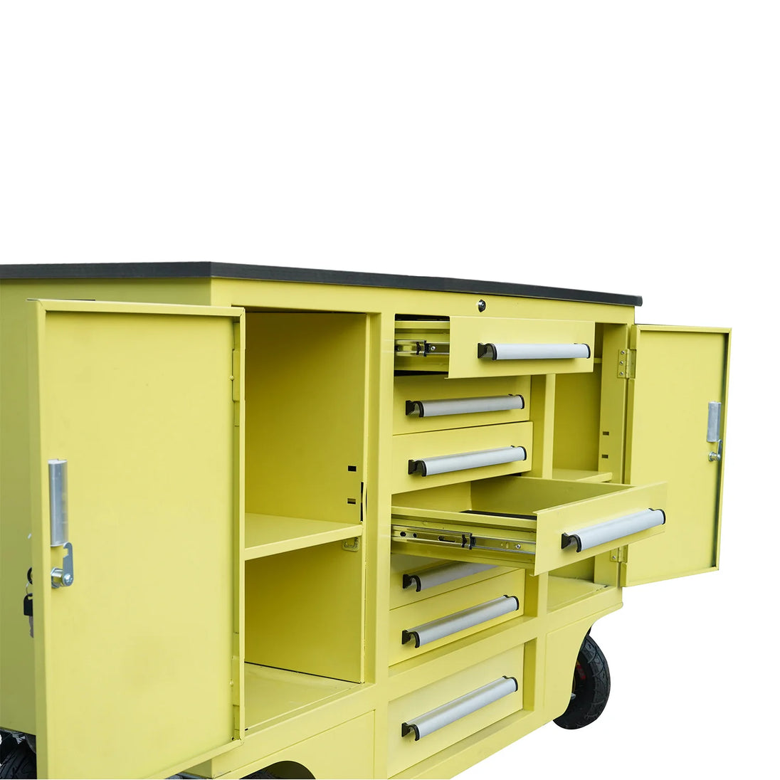 Featuring 7 drawers and 2 cabinets, this rolling workbench provides versatile storage for tools, parts, and equipment while keeping everything organized and within reach. The stainless steel work surface adds durability and easy maintenance, making it ideal for garages, workshops, and industrial environments.